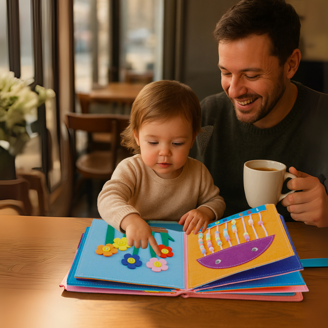 The Busy Book supports a range of developmental skills including fine motor skills, hand-eye coordination, colour and shape recognition, early counting, problem-solving, and independence through self-guided play.